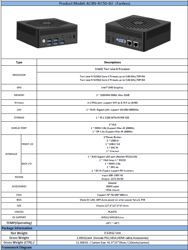 Note : Nos AC8-N150 sont configurés avec un port VGA (pas de port RS232)